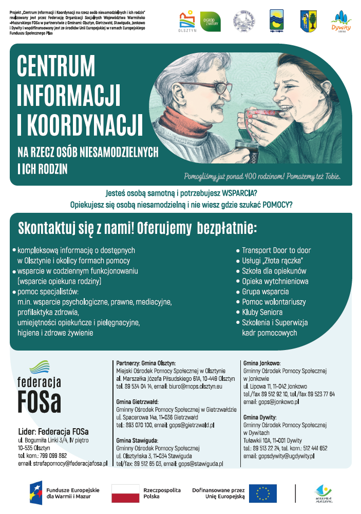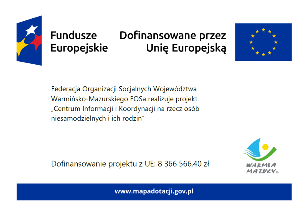 Federacja FOSa wraz z Gminą Olsztyn, Gminą Dywity, Gminą Jonkowo, Gminą Gietrzwałd i Gminą Stawiguda realizuje projekt „Centrum Informacji i Koordynacji na rzecz osób niesamodzielnych i ich rodzin”. Projekt jest współfinansowany ze środków Unii Europejskiej w ramach Europejskiego Funduszu Społecznego Plus Programu w ramach programu Fundusze Europejskie dla Warmii i Mazur.